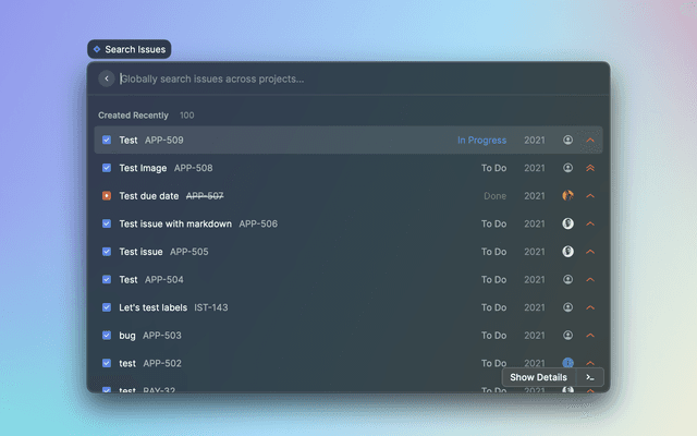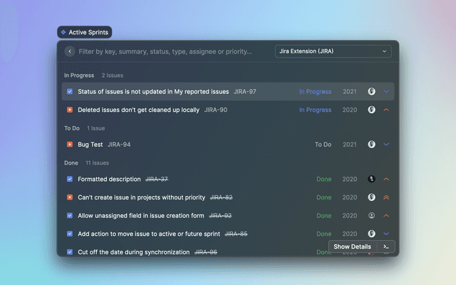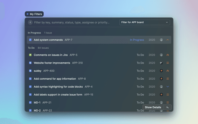 Search for Jira issues (more tolerant and powerful than built-in), projects, boards and filters.