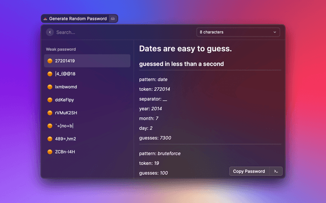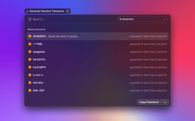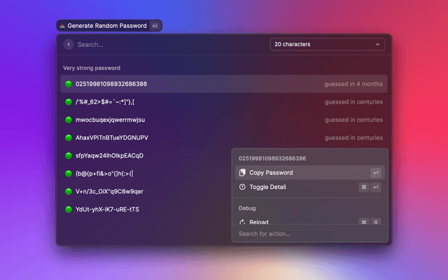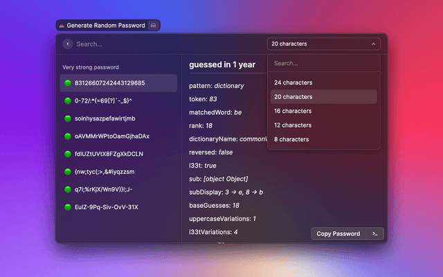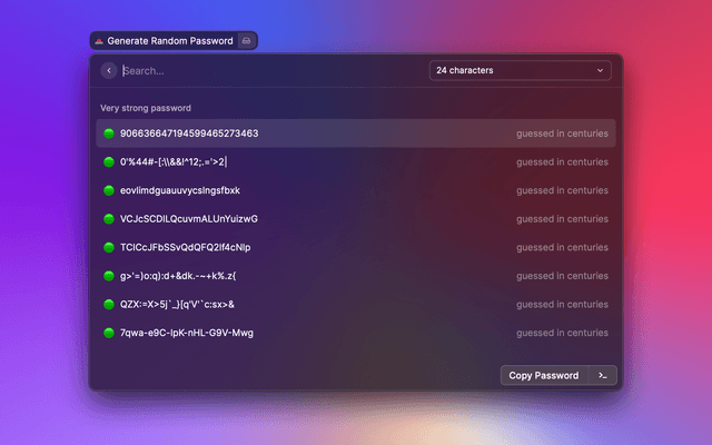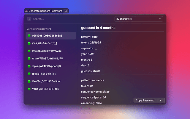 Generates a password from 5–64 characters with options for case, special characters, and more